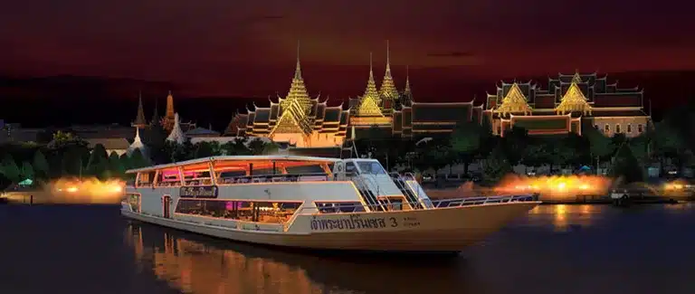 Pelayaran makan malam yang luar biasa membawa Anda dalam tur di sepanjang jalur ikonik Sungai Chao Phraya, di mana Anda akan melewati beberapa landmark seperti Wat Arun, Grand Palace, Wat Phra Kaew, Jembatan Rama VIII, dan Asiatique the River Front. Nikmati minuman selamat datang Anda sambil menikmati panorama cakrawala kota Bangkok di malam hari. Anda kemudian akan menikmati makan malam prasmanan internasional sambil menonton hiburan langsung melalui pertunjukan tari klasik Thailand.