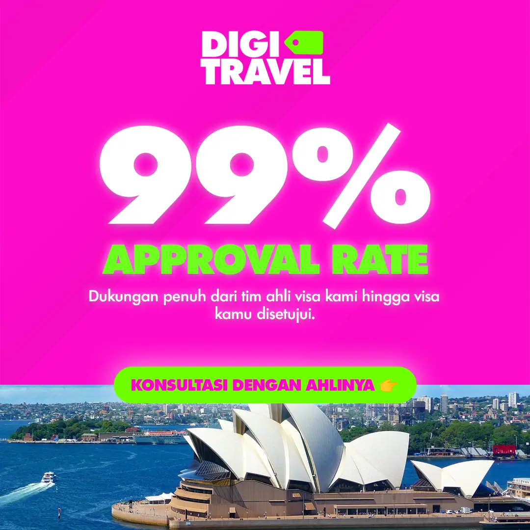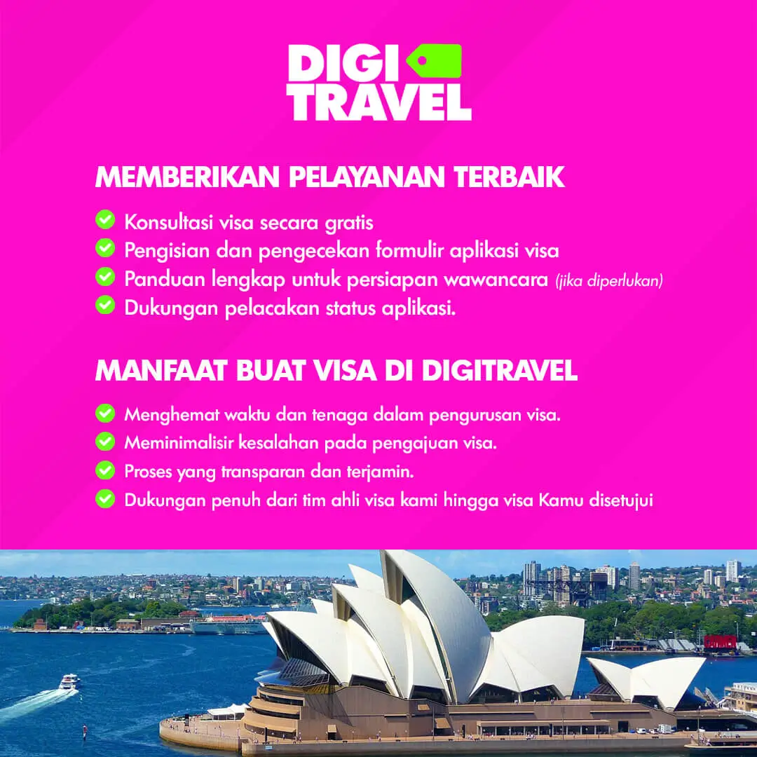 Layanan Visa Australia kami membantu Anda dalam proses pengajuan visa yang cepat dan mudah. Kami melayani Visa Turis sesuai dengan kebutuhan perjalanan Anda ke Australia. DIGITRAVEL kami akan memastikan bahwa seluruh dokumen dan persyaratan Anda diproses dengan tepat sehingga meminimalisir risiko penolakan.