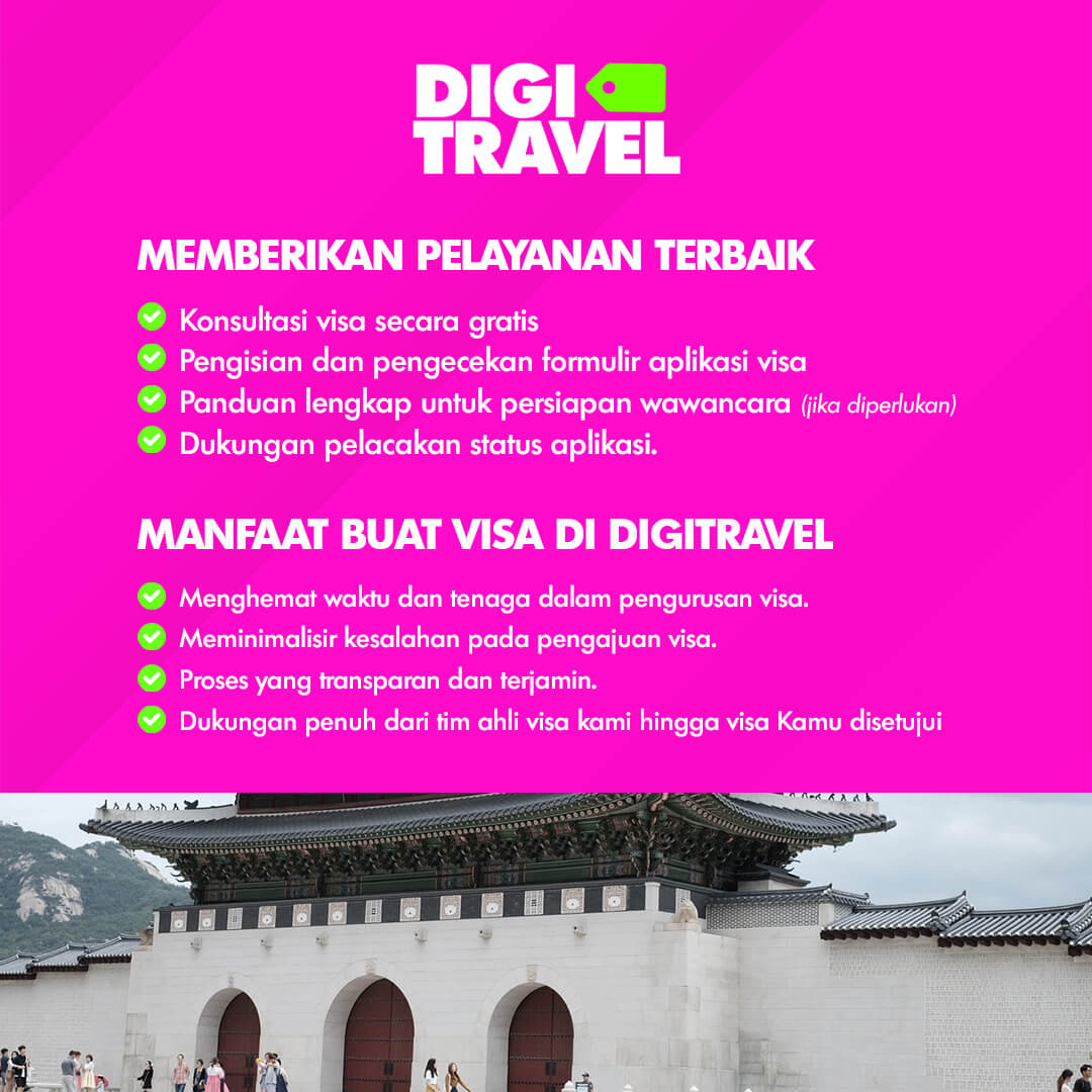 Layanan Visa South Korea kami membantu Anda dalam proses pengajuan visa yang cepat dan mudah. Kami melayani Visa Turis sesuai dengan kebutuhan perjalanan Anda ke South Korea. DIGITRAVEL kami akan memastikan bahwa seluruh dokumen dan persyaratan Anda diproses dengan tepat sehingga meminimalisir risiko penolakan.