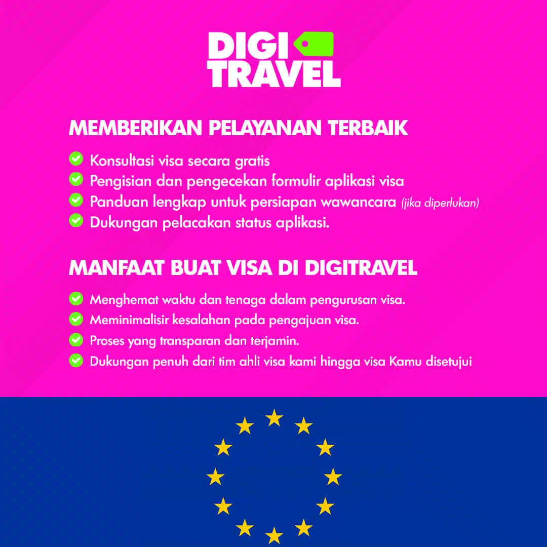 Layanan Visa Austria / Slovenia, Belanda, Denmark, Finlandia, Italia, German, Norwegia, Perancis, Spanyol, Swedia, Swiss kami membantu Anda dalam proses pengajuan visa yang cepat dan mudah. Kami melayani Visa Turis sesuai dengan kebutuhan perjalanan Anda ke negara Schengen . DIGITRAVEL kami akan memastikan bahwa seluruh dokumen dan persyaratan Anda diproses dengan tepat sehingga meminimalisir risiko penolakan.