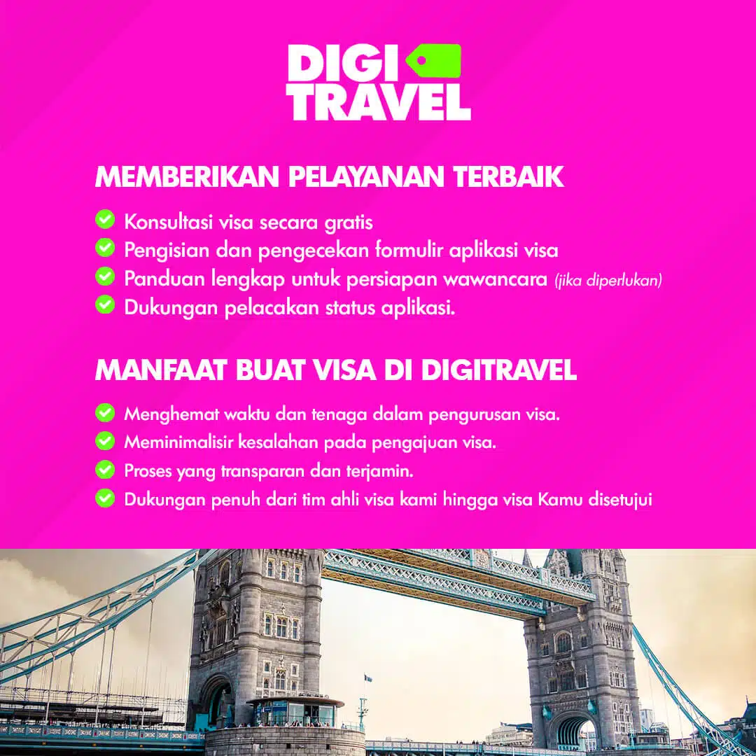 Layanan Visa UK kami membantu Anda dalam proses pengajuan visa yang cepat dan mudah. Kami melayani Visa Turis sesuai dengan kebutuhan perjalanan Anda ke UK . DIGITRAVEL kami akan memastikan bahwa seluruh dokumen dan persyaratan Anda diproses dengan tepat sehingga meminimalisir risiko penolakan.
